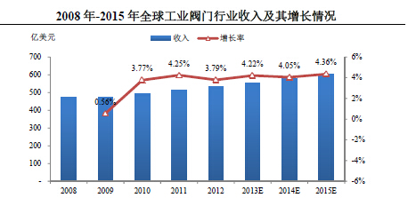 從中長(cháng)期來(lái)看,影響閥門(mén)行業(yè)的下游行業(yè)擴張的主要因素,包括不斷增長(cháng)的能源需求、全球人口的持續增加以及發(fā)展中國家的城市化、工業(yè)化進(jìn)程并沒(méi)有因金融危機而發(fā)生根本性改變。目前全球各主要經(jīng)濟體都已經(jīng)進(jìn)入經(jīng)濟復蘇周期(根據國際貨幣基金組織的統計和預測數據,2010年、2011年和2012年全球經(jīng)濟增長(cháng)實(shí)現恢復性增長(cháng),增長(cháng)率分別為5.3%、3.9%和3.2%,2013年和2014年全球經(jīng)濟年增長(cháng)速度預計為2.9%和3.6%)。閥門(mén)行業(yè)自2010年也開(kāi)始走向復蘇,根據McIlvaine的調查和預測數據,2010年、2011年和2012年,全球工業(yè)閥門(mén)行業(yè)收入分別為492.24億美元、513.17億美元和532.61億美元,增長(cháng)率恢復至3.77%、4.25%和3.79%,2013年-2015年全球工業(yè)閥門(mén)行業(yè)的預計銷(xiāo)售增長(cháng)率將分別達到4.22%、4.05%和4.36%,呈現穩步上升的增長(cháng)態(tài)勢。